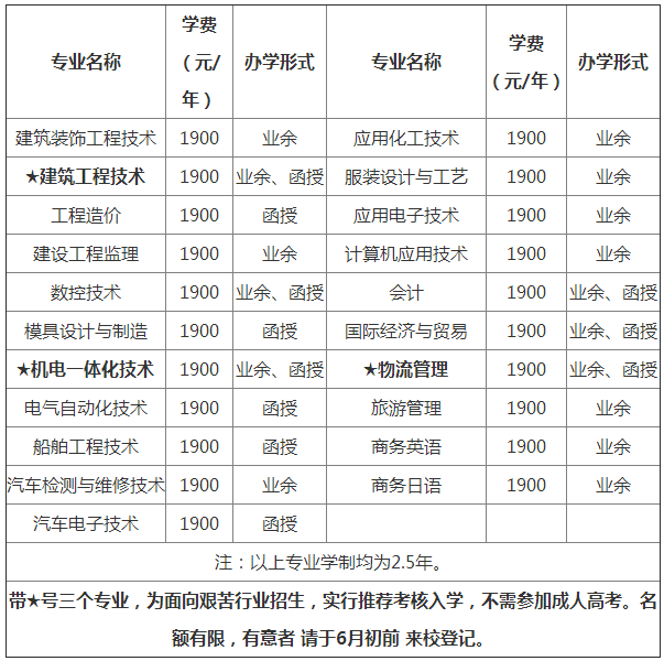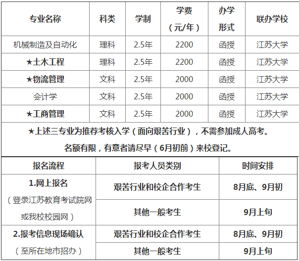 南通职业大学始建于1973年,是一所经教育部批准,覆盖工、文、管理和艺术类的公办全日制普通高等学校,设有机械、电子、化工、建工、交通、经管、艺术、外国语等8个学院58个专业。学校规模、质量在全省属于第一方阵,是南通高等职业教育的龙头院校、江苏高等职业教育的主力院校。现有教职工800多人,其中正、副教授220多人,博士、硕士研究生300多人,各级各类在校生近20000人,其中继续教育学院在籍学员4000多名。学校以厚基础、重实践的办学特色,已为江苏省及地方经济发展培养了大批高素质、高技能人才。成人教育招生专业情况如下: