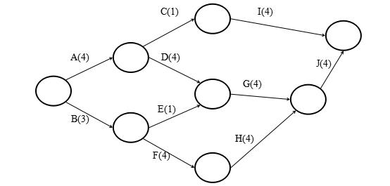 1.在一个小型建设项目开始的时候,准备图示的AOA网络图。每项活动字母后面的数字是一天为单位的工时。关键路径是哪条?我们应当最关注哪条路径?