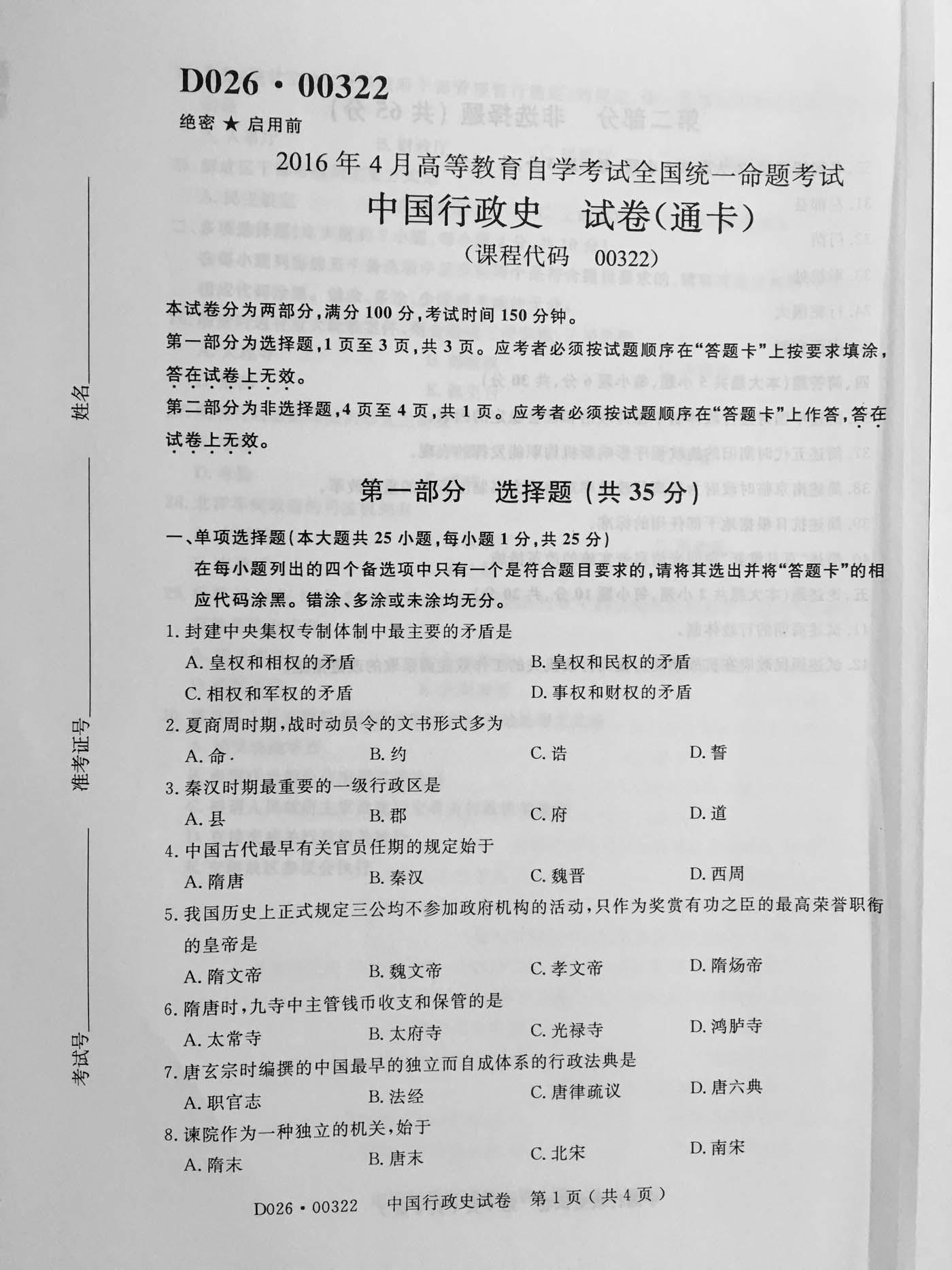 【历年真题】全国2016年4月自学考试《中国行政史》试题和答案00322