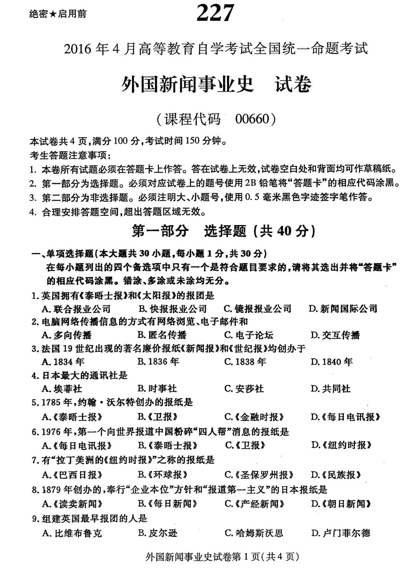 全国2016年4月自考《外国新闻事业史》试题和标准答案00660
