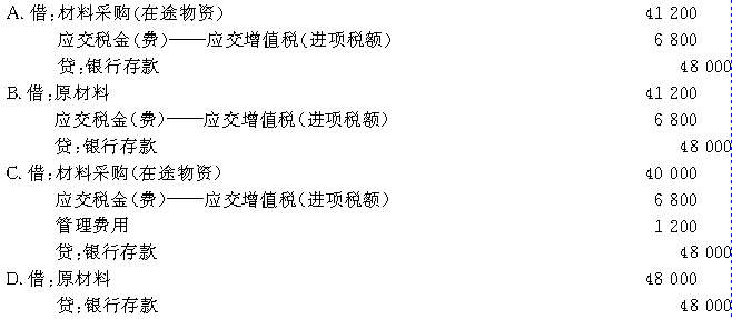 第6题 某企业购入材料一批,买价为40 000元,增值税进项税额为6 800元,运杂费为1 200元,款项以银行存款付讫,材料尚未运达。其正确的会计分录是【】