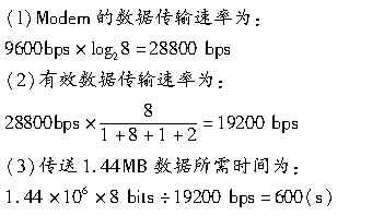 第1题 设有一调制解调器,波特率为9600波特(信号速率),采用的调制技术为PAM,共有8种状态,问当使用一位校验位、两位停止位、八位数据位的情况下,该 Modem有效数据传输速率为多少?当有1. 44MB的文件需要传输时,至少需要多长时间?