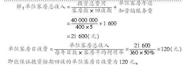 第1题 建设某宾馆共投资4 000万元,宾馆建成后有400间客房供营业,预计回收期为开业后5年。在5年中,年平均客房使用率为50%,每一客房分担的服务管理费为每年1 600元。试计算能保证投资按期回收的单位客房日收费标准。